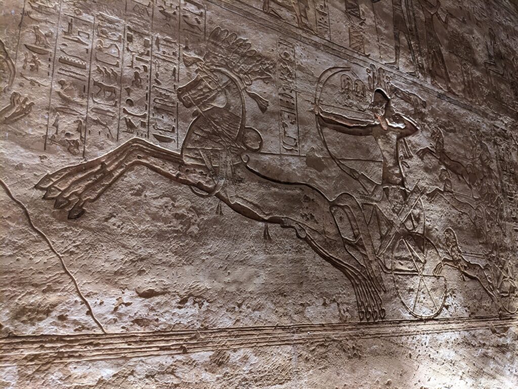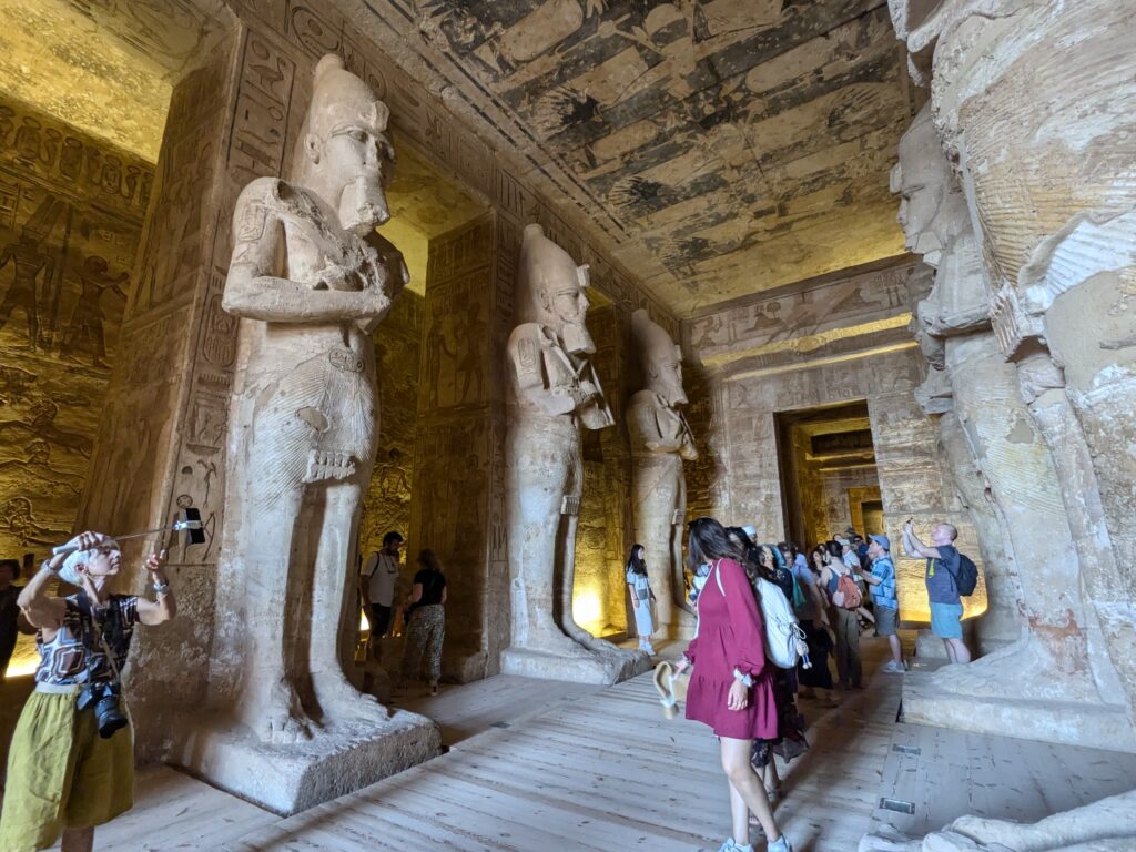 Inside, the temple extends deep into the rock, with pillared halls, carved reliefs, and a sanctuary aligned so that twice a year, the rising sun illuminates the statues within — a solar event that still occurs today.