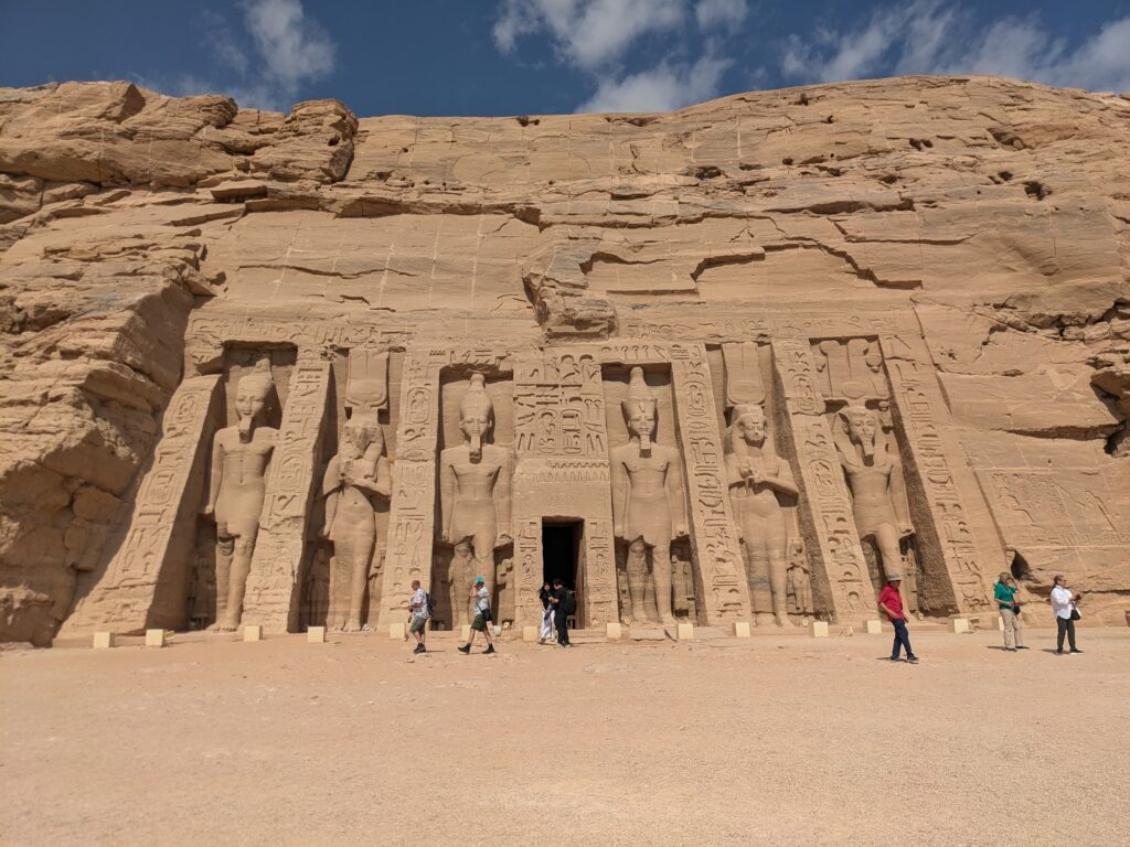 The Small Temple is equally impressive in its own way. Its façade features six statues — four of Ramesses and two of Nefertari — carved at equal height. This was a rare honor for a queen and speaks to Nefertari’s importance.