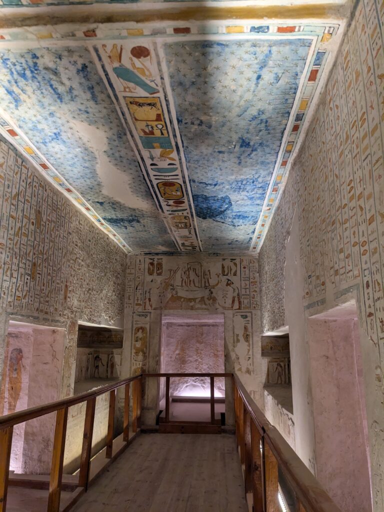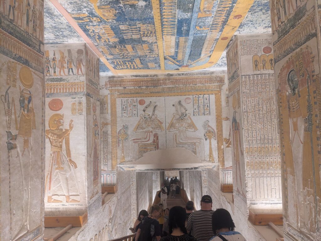 The moment you step inside, the scale hits you. The ceilings soar higher, the chambers widen, and the artwork becomes almost cosmic. This tomb is famous for its astronomical ceiling — a swirling map of stars, constellations, and deities that turns the entire burial chamber into a celestial dome.