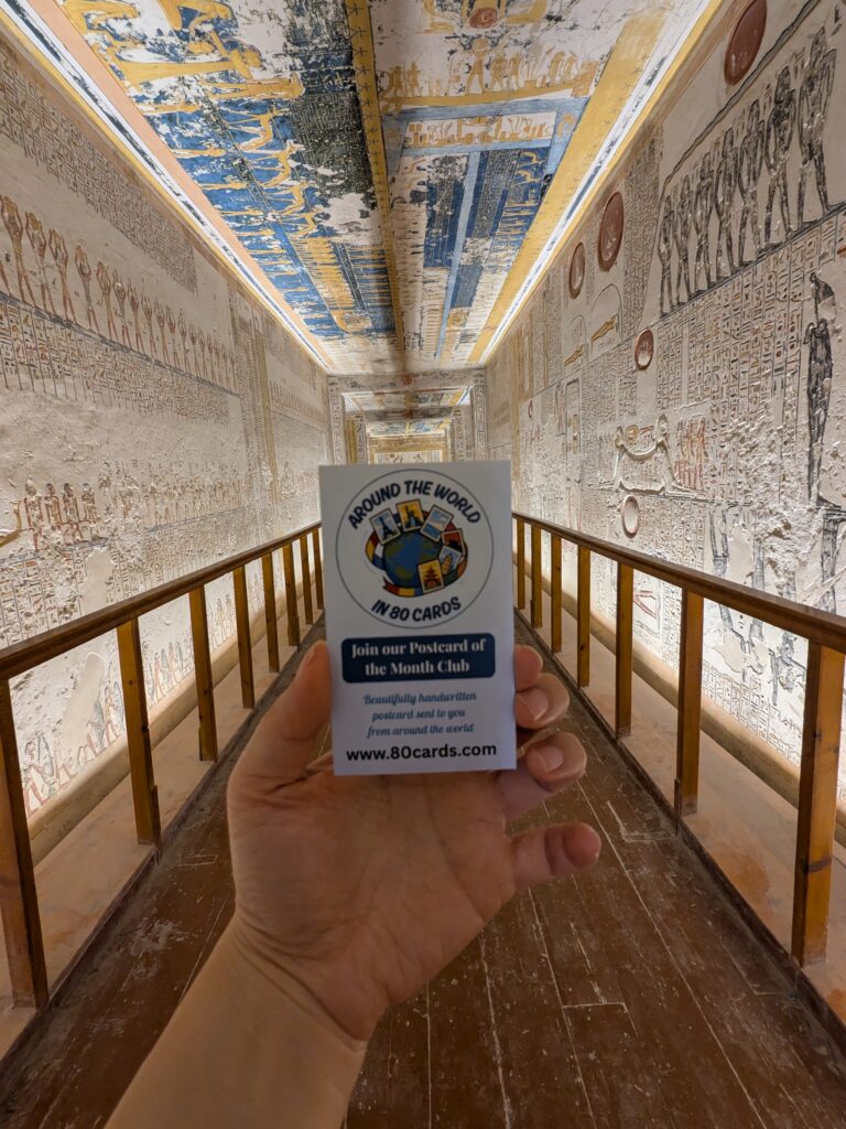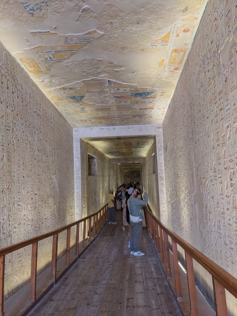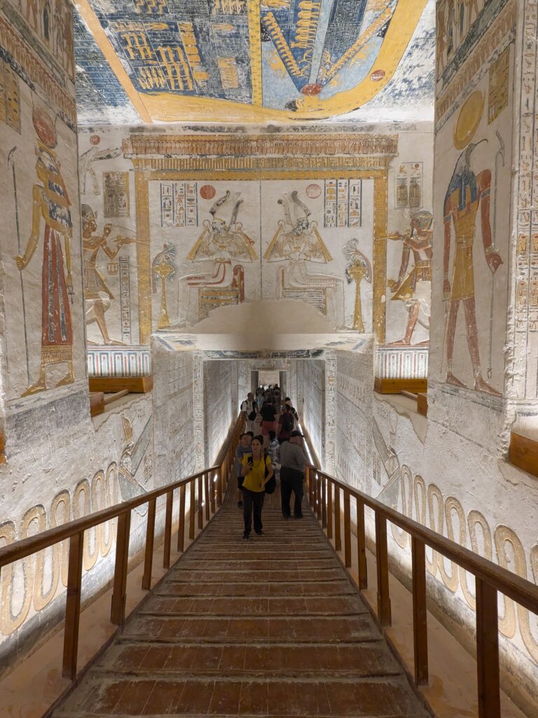 Ramses IV’s tomb is one of the most direct in the valley — a long, straight descent that feels like walking into a story. The stairway drops gently underground, and the deeper you go, the more the walls come alive.