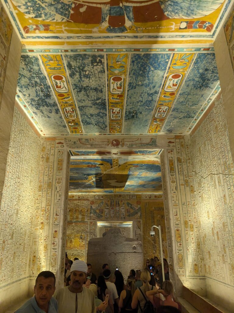 The ceiling is a deep blue, sprinkled with stars, as if the sky itself followed you underground. It’s strangely comforting. You feel like you’re walking with the pharaoh, step by step, into the next world.