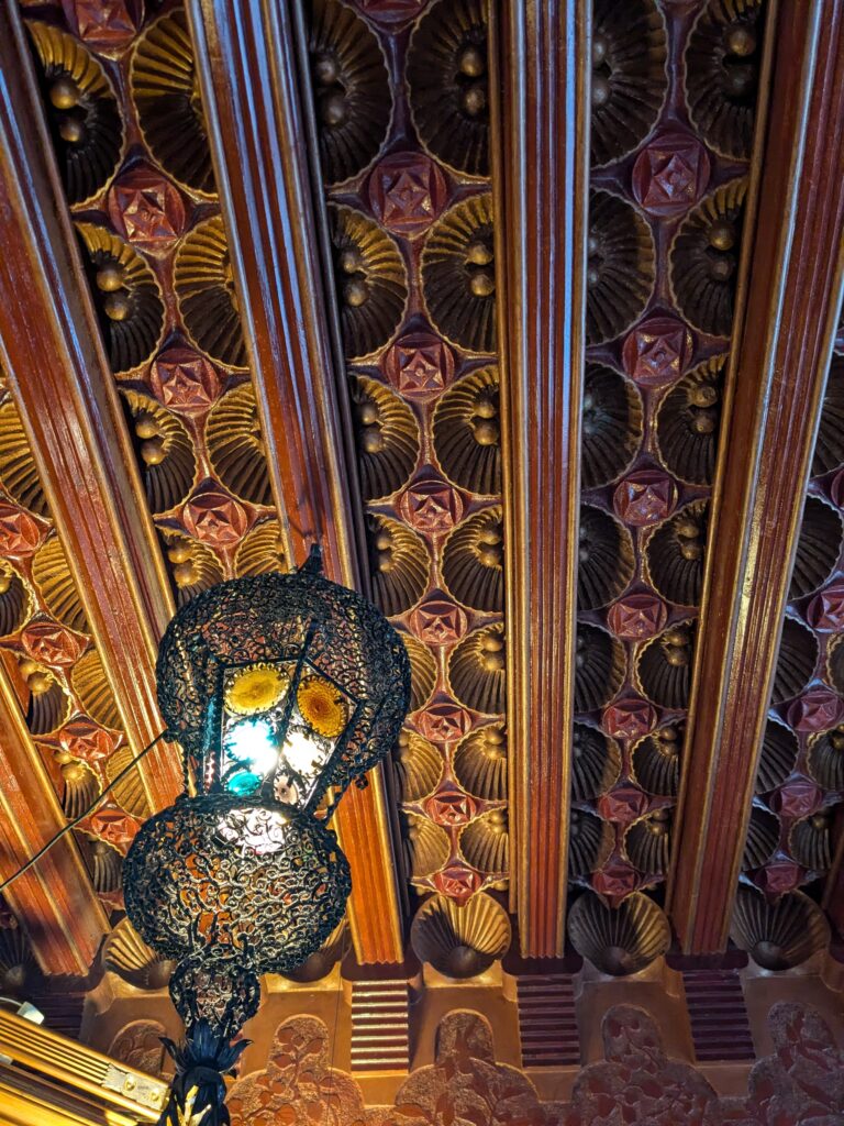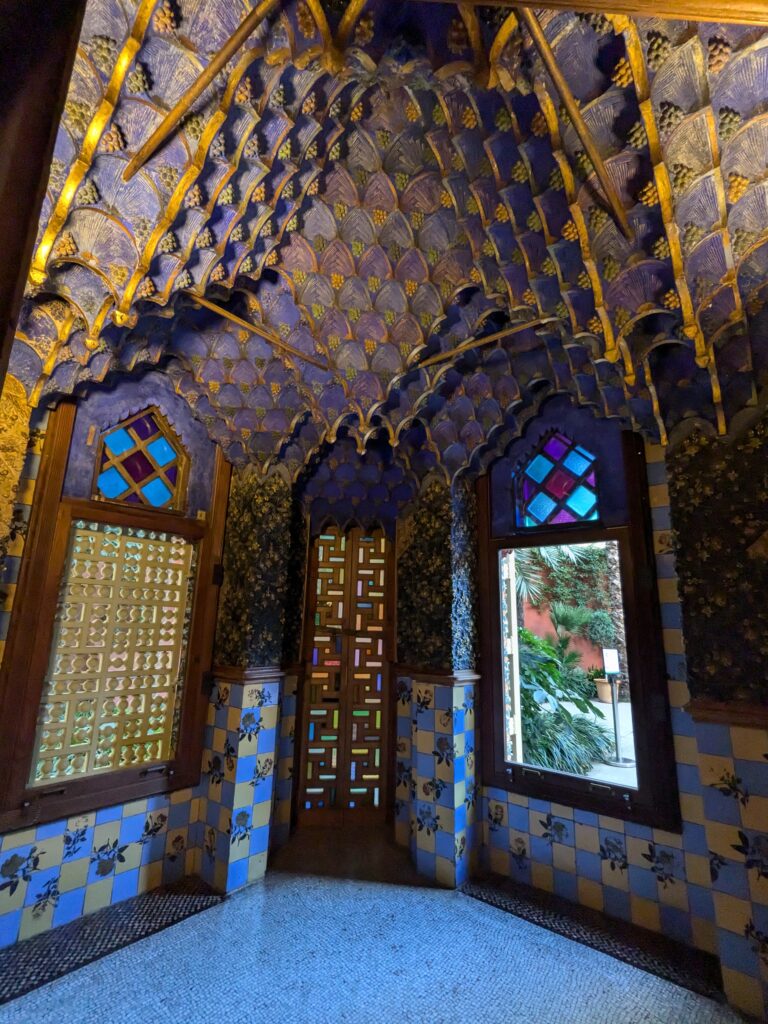 What makes this room so striking is its atmosphere. Gaudí leaned heavily into Arabian influences, creating a space that feels like a tiny desert pavilion. The ceiling is painted a deep, velvety blue — the colour of a night sky — while the muqarnas, those honeycomb‑like sculptural forms borrowed from Islamic architecture, resemble palm leaves heavy with dates. Even in photographs, the room has an intimate, almost dreamlike quality, as if it were designed for storytelling as much as smoking.