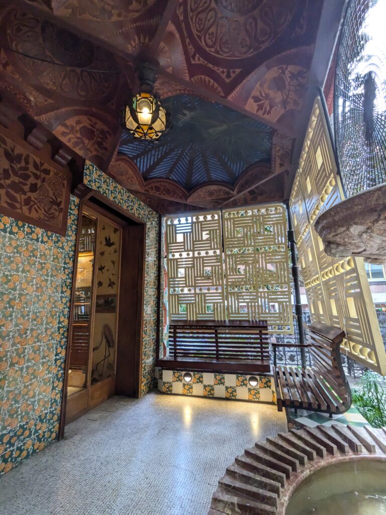 The covered porch at Casa Vicens is one of those spaces where you can almost feel Gaudí thinking. It has been altered over the years — at one point the original fountain was removed entirely — but thanks to a stroke of luck and the cooperation of former owners, the fountain was eventually found in the garden of a house in Girona and brought back home. Restored and returned to its original position, it now sits once again where Gaudí intended, quietly anchoring the porch with the sound of running water.