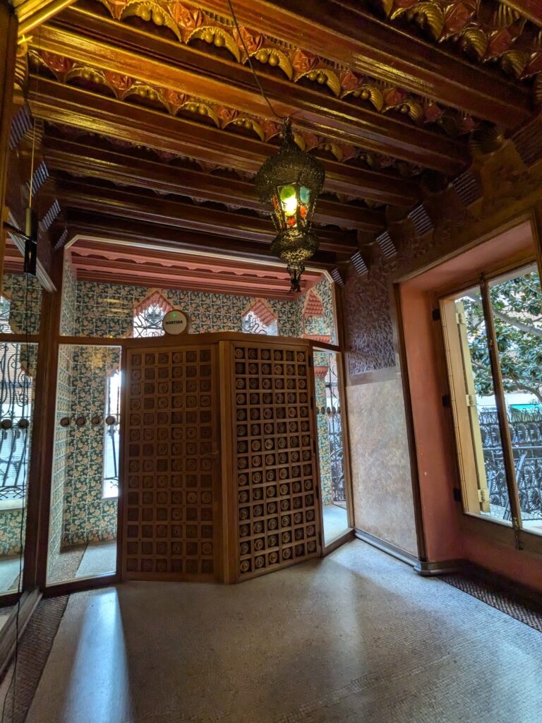 The porch also reveals Gaudí’s practical side. Hidden inside the doorposts are mechanisms that were likely designed to secure the space with bars — a discreet early example of integrated security. The tilting blinds, meanwhile, regulate both light and airflow, keeping the porch and the adjoining dining room cool and comfortable.