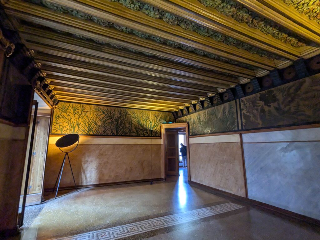 The furniture in the room is original, designed specifically for this space. Gaudí commissioned it himself, and the paintings that adorn the cabinets and panels were created by Francesc Torrescassana i Sellarés to match the room’s botanical theme. Over the decades, smoke and dust dulled their colours, giving everything a brownish cast. Thanks to careful restoration, the original tones now shine again — vivid greens, soft pinks, the warm glow of wood — revealing just how vibrant the room must have looked when it was first completed.