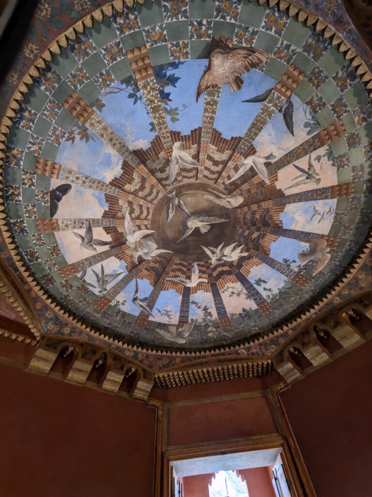 This particular sitting room, perched above the smoking room, was likely intended for the women of the household. It has a softness to it, a sense of privacy and calm that contrasts with the more masculine atmosphere downstairs. The dome overhead is painted with a scene so delicate it feels almost like a window to the sky. Gaudí sketched one of the rooftop towers inside it, as if the architecture itself were drifting into view through an opening in the ceiling. Even in photographs, the illusion is convincing — you can almost imagine birds fluttering past.