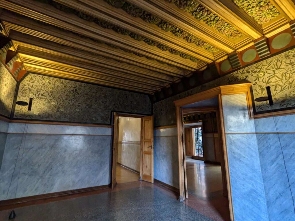 During the restoration of the house, conservators made an unexpected discovery: the gold that once covered the muqarnas wasn’t original. Beneath it lay the original blue polychrome, hidden for decades under later layers. Restoring it was painstaking work — months spent in a room barely large enough for a handful of people — but the result is remarkable. Today, the ceiling and walls reveal both histories: the restored blue that Gaudí intended, and traces of the later gold that once covered it.