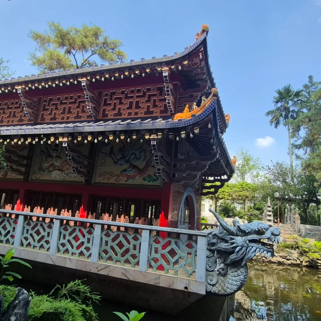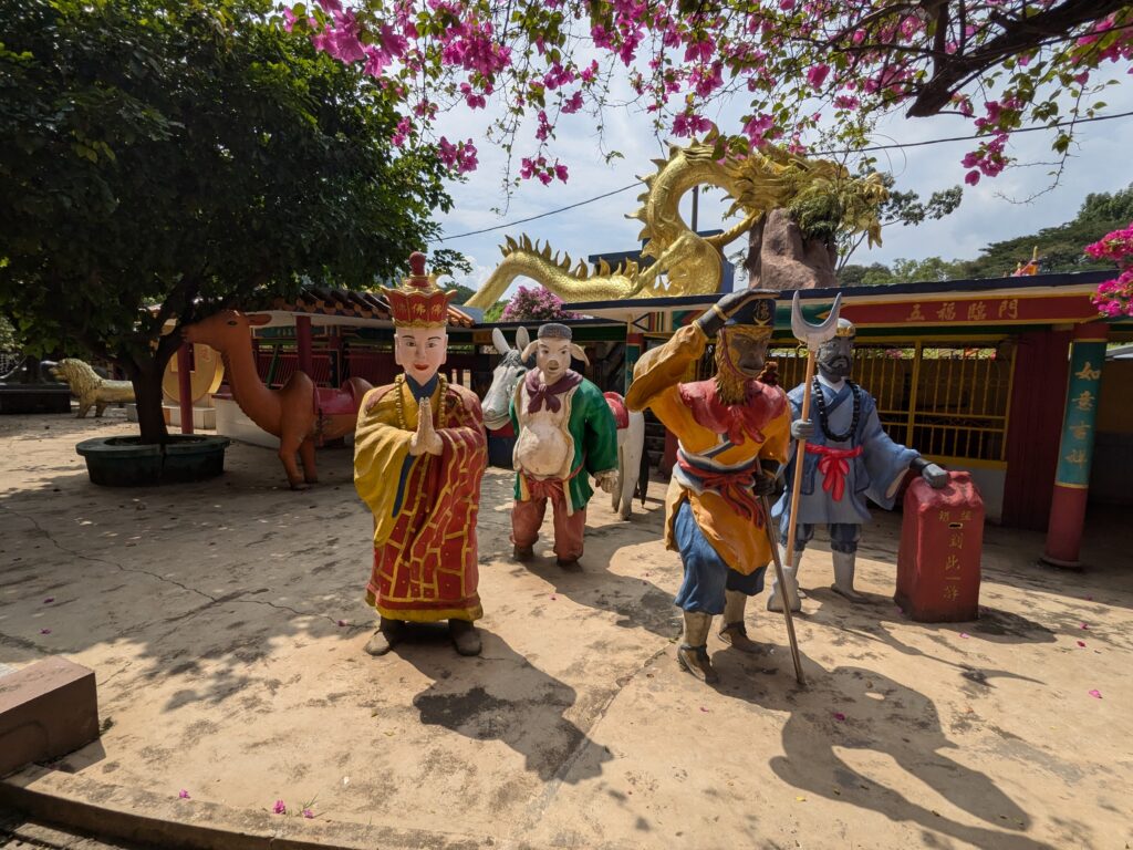 Ling Sen Tong is nothing like the others, and that’s exactly why I loved it. If the other temples are serene and contemplative, this one is joyful, almost whimsical. The garden in front is filled with bright, cartoon‑like statues from Chinese mythology — dragons, deities, and even the Monkey King from Journey to the West.