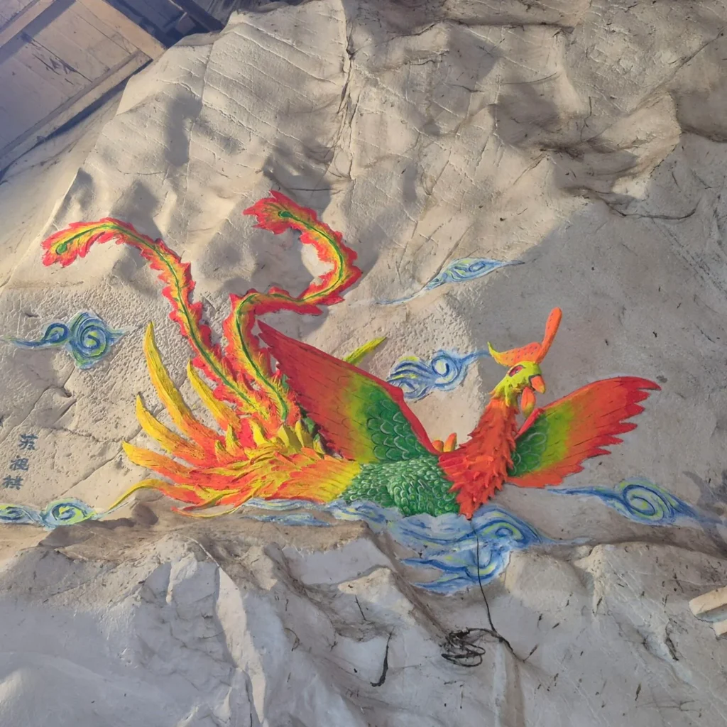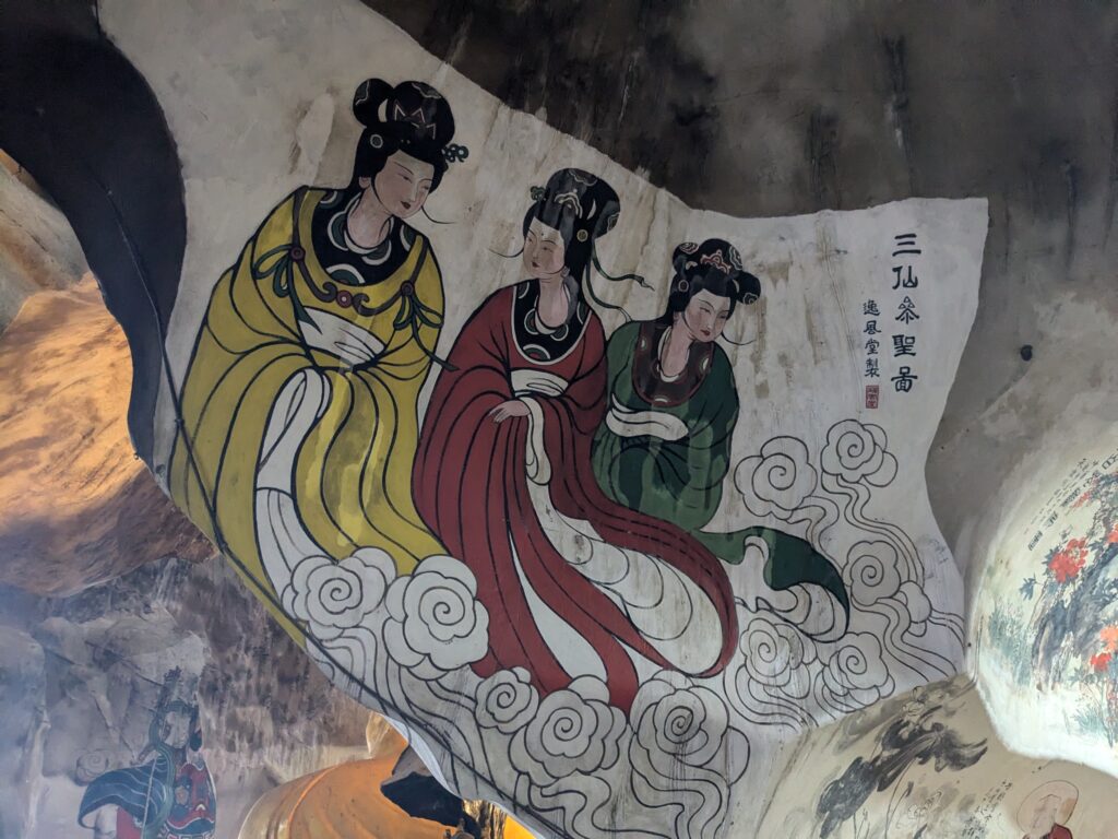 The walls are covered in bright murals — dragons, deities, swirling clouds — scenes from Chinese mythology painted right onto the limestone. They’re vibrant but softened by time, like stories whispered rather than shouted.