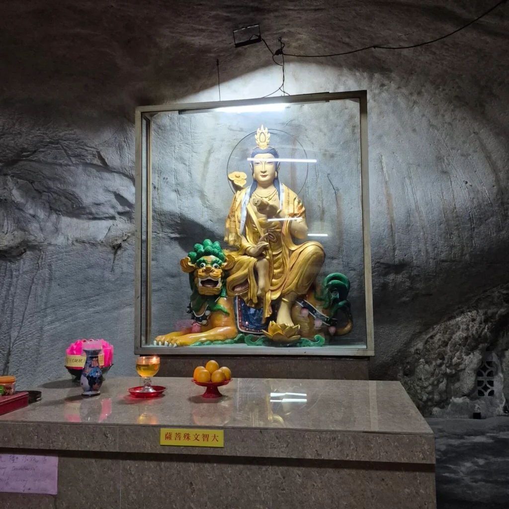 There’s a hush here that feels almost instinctive. Even the light seems softer. The temple follows the Mahāyāna Buddhist tradition, and the statues and altars blend into the cave rather than standing apart from it. It feels like the mountain is holding the temple, not the other way around.
