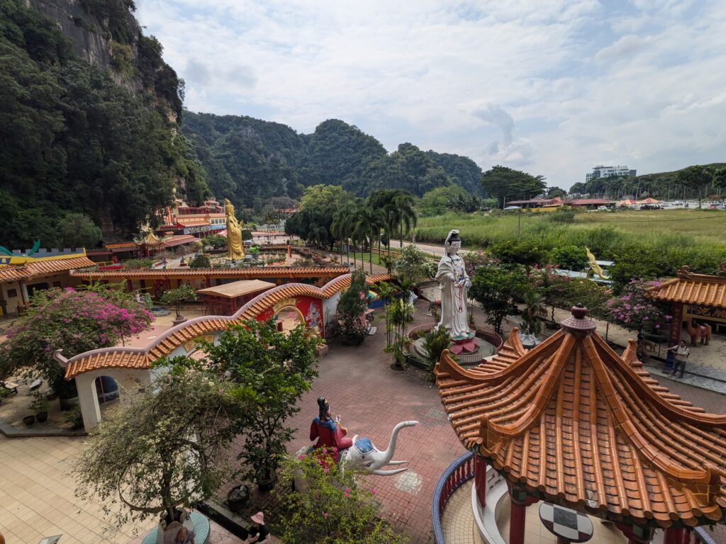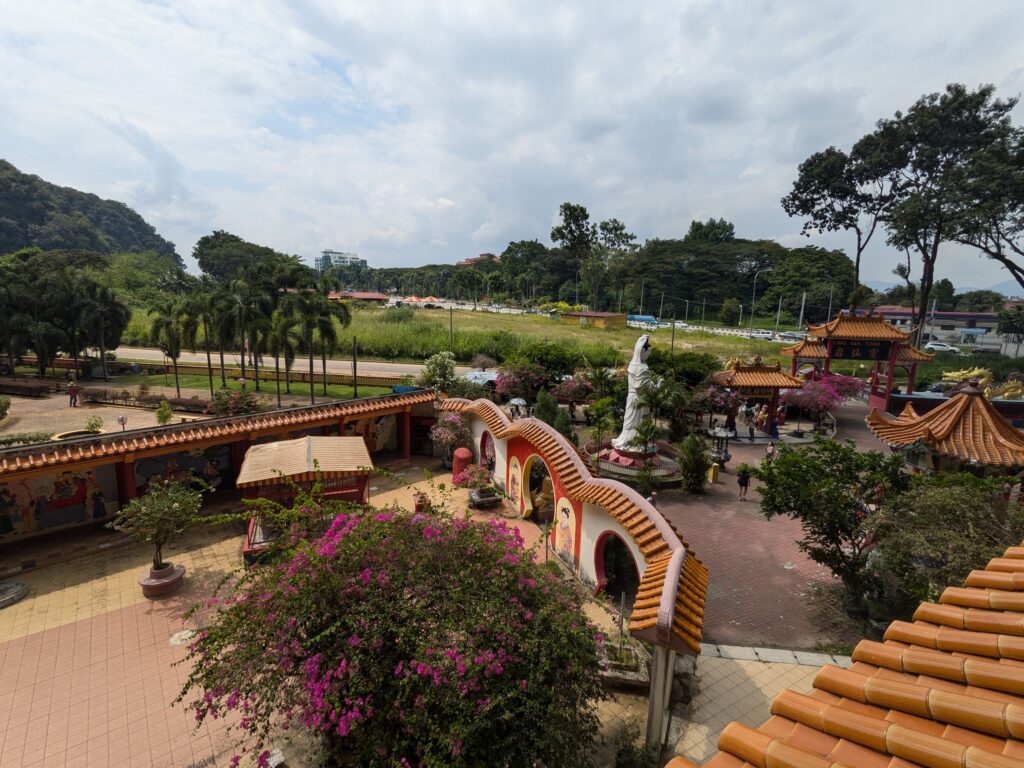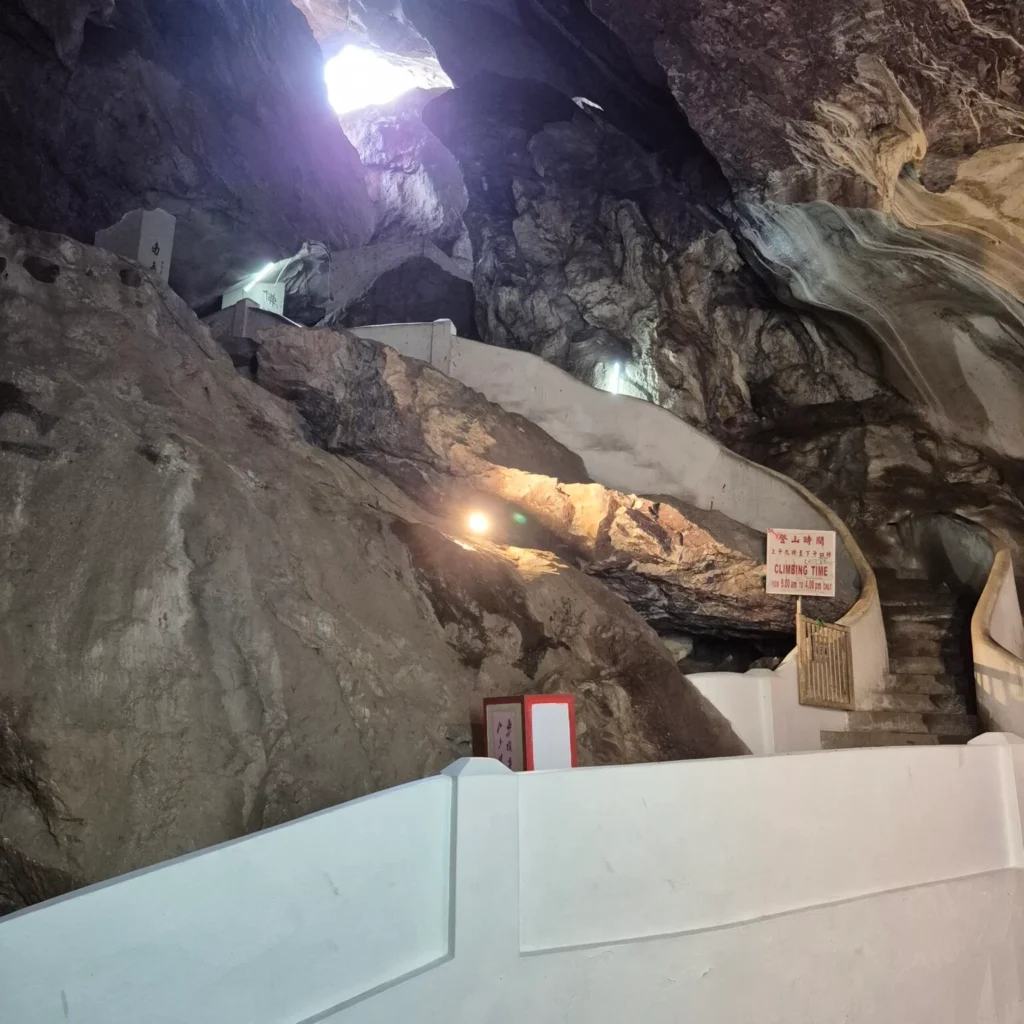 Behind the Buddha, a staircase disappears into the rock. I climbed it — all 450‑plus steps — winding through narrow passages and sudden openings until I emerged onto the hillside. At the top, a small pavilion overlooks the northern suburbs of Ipoh. The view is wide and quiet, the kind that makes you feel like you’ve earned it.