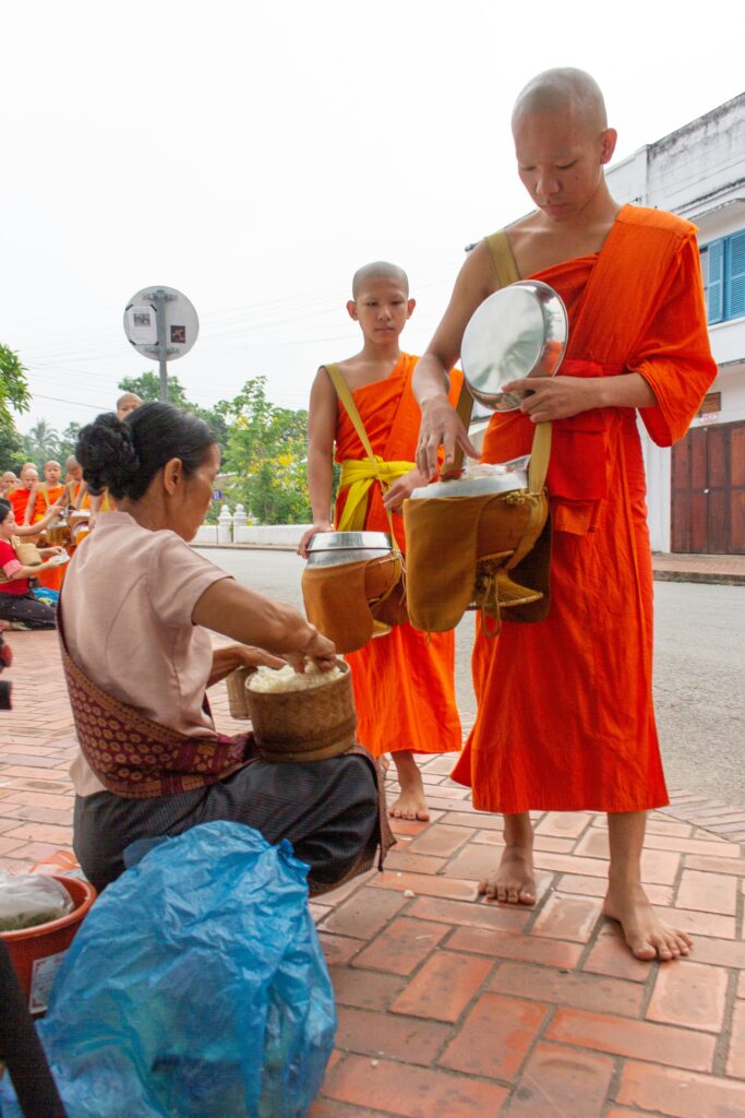 Around sunrise, we walk barefoot through the village for alms round. People wait outside their houses with rice, fruit, sometimes just small snack. They give with smile, and we give blessing back — for prosperity, good lucks, and to stay safe from any dangers. Monks cannot choose food, so sometimes you get spicy curry, sometimes only sticky rice and banana. We are taught to ebe easy person, not difficult person. But when you eat with calm mind, everything taste enough.