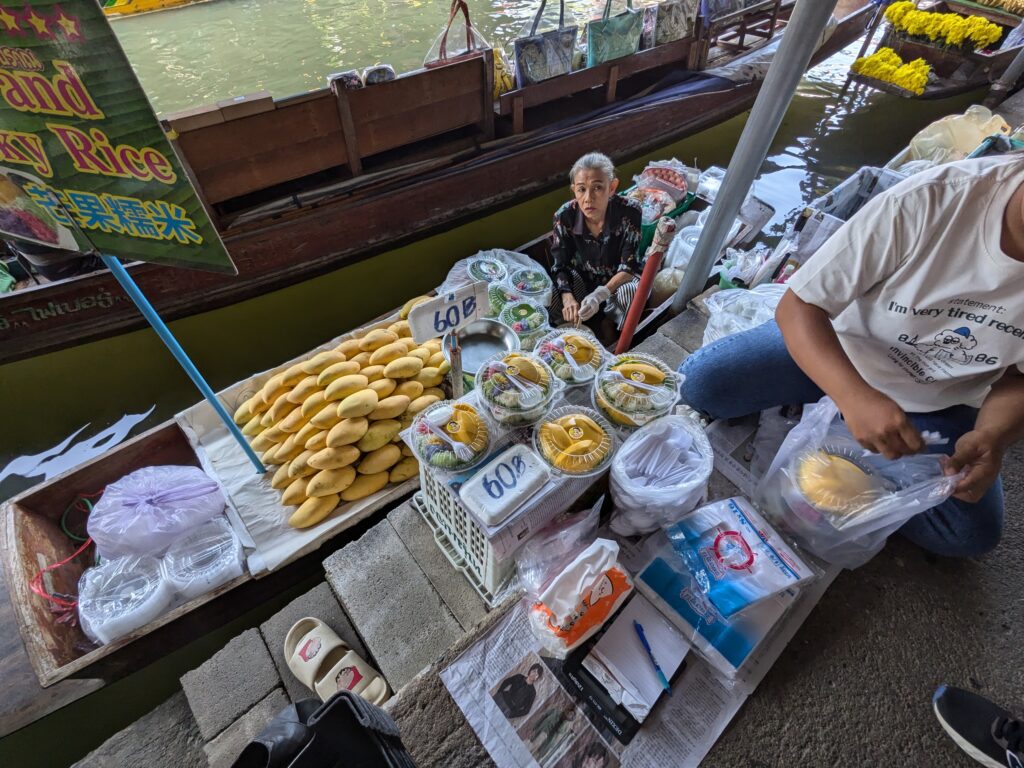 The format of the market is simple but beautiful. The boats line up along the canal, some moving slowly, some tied to the side. People on the walkway lean down to buy, and other people come in boats paddle close to each other to buy. Everything happen at water level. When you want something, you call softly to the seller, and they paddle closer. They pass the food to you with long bamboo stick, or sometimes with small net basket. You give money the same way – put it in the basket, and they pull it back. No rush, no pushing, no stress. Just gentle exchange, like old friend sharing food.